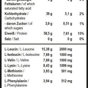 — 7,61 г аминокислот на порцию (изолейцин, лейцин, валин, лизин, метионин, треонин, триптофан и фенилаланин),