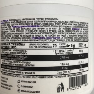 OstroVit Citrulline спортивна харчова добавка, її основа цитрулін малат, збагачений таурином та вітаміном В6. Цитрулін у поєднанні з яблучною кислотою є найефективнішою формою даної амінокислоти. Яблучна кислота у свою чергу, покращує дію та засвоюваність цитруліну. Безперечно, одним з найважливіших ефектів використання OstroVit цитруліну є збільшення продуктивності, прискорення відновлення та поліпшення кровопостачання м’язів. Спортсмен може тренуватися інтенсивніше, а кровонаповнення буде в рази кращим. Якщо ви будете використовувати цитрулін відразу після тренування, ви відчуєте меншу втому, також препарат сприяє швидкому виведенню з організму токсинів.