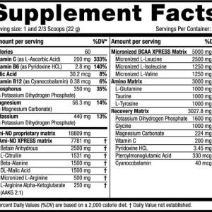 Ми подбали про те, щоб надати вам мікронізовані амінокислоти для швидшого засвоєння, включаючи мікронізовані BCAA та мікронізований L-аргінін (попередник оксиду азоту та креатину). І на додаток до всього ми додали чистий L-цитрулін (ще кращий підсилювач оксиду азоту!) разом із яблучною кислотою та L-аргініну альфа-кетоглутаратом (AAKG), які є ключовими проміжними продуктами важливих метаболічних циклів. Усі додаткові амінокислоти, бета-аланін, вітаміни та мінерали також будуть тримати вас у курсі під час важких, пітних тренувань!