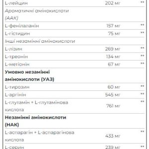 Комплекс насичує організм усіма типами амінокислот. Прийом препарату забезпечить організм зарядом енергії на тривалий час, поліпшить набір м’язової маси, захистить м’язи від катаболізму, нормалізує роботу імунної системи, зміцнить суглоби і зв’язки, підвищить витривалість організму і прискорить швидке відновлення після виснажливих тренувань.