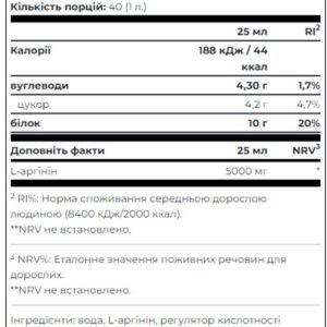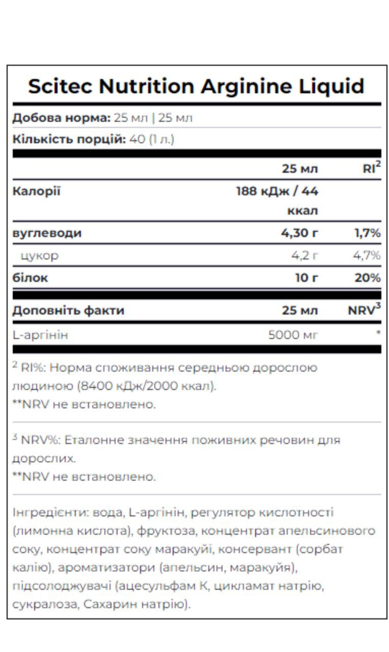 Склад 1 порції (25 мл) Scitec Nutrition Arginine Liquid: енергетична цінність – 188 кДж / 44 ккал; жири – 0 г; з них насичені – 0 г; вуглеводи – 4,3 г; з них цукри – 4,2 г; протеїн – 10 г; аргінін – 5 г. Інгредієнти: вода, рідкий L-аргінін, лимонна кислота, фруктоза, концентрат апельсинового соку, концентрат соку з маракуї, сорбат калію, ароматизатори (апельсин, маракуя), підсолоджувачі (ацесульфам K, цикламат натрію, сукралоза, сахарин натрію). Спосіб вживання: Струсити пляшку, змішати 25 мл добавки з 250 мл води. Приймати за півгодини до тренування.