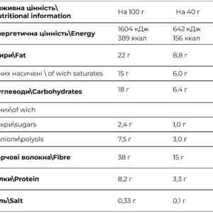 • Кокосова стружка 21-24% в складі – містить харчові волокна, і відмінно очищає кишечник від шлаків і токсинів. Кокосовий горіх багатий вітамінами, мікро – і макроелементами. Він містить лауринову кислоту, яка нормалізує рівень холестерину в крові.