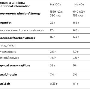 • Кокосова стружка 21-24% в складі – містить харчові волокна, і відмінно очищає кишечник від шлаків і токсинів. Кокосовий горіх багатий вітамінами, мікро – і макроелементами. Він містить лауринову кислоту, яка нормалізує рівень холестерину в крові.