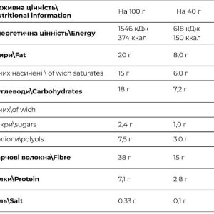 • Кокосова стружка 21-24% в складі – містить харчові волокна, і відмінно очищає кишечник від шлаків і токсинів. Кокосовий горіх багатий вітамінами, мікро – і макроелементами. Він містить лауринову кислоту, яка нормалізує рівень холестерину в крові.