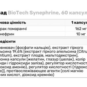 Склад 1 порції (1 капсули) BioTech (USA) Synephrine: екстракт плодів Citrus aurantium – 162 мг; з них синефрин – 10 мг. Інгредієнти: наповнювач (фосфати кальцію), екстракт гіркого апельсина 19,6% [екстракт плодів гіркого апельсина (Citrus aurantium), мальтодекстрин], оболонка капсули [желатин, глазур (шелак), барвник (оксиди і гідроксиди заліза), регулятор кислотності (гідроксид амонію), регулятор кислотності (гідроксид калію)], антизлежувач (магнієві солі жирних кислот, діоксид кремнію). Спосіб вживання: Приймати по 1 капсулі в день, запиваючи водою.