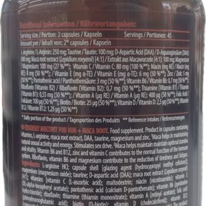 L-аргінін HCl, оболонка капсули [глазуруюча речовина (гідроксипропілметилцелюлоза)], магній (оксид магнію), таурин, D-аспарагінова кислота, екстракт кореня маки (Lepidium meyenii) [4: 1], вітаміни [вітамін С (L-аскорбінова кислота) ), мальтодекстрин, ніацин (амід нікотинової кислоти), вітамін Е (DL-альфа-токоферилацетат), пантотенова кислота (кальцію D-пантотенат), вітамін В6 (піридоксину гідрохлорид), рибофлавін, тіамін (тіаміну мононітрат), вітамін А (ретиніл ацетат), фолієва кислота (птероілманноглутамінова кислота), біотин (D-біотин), вітамін D (холекальциферол), вітамін B12 (ціанокобаламін)], цинк (оксид цинку), засіб, що запобігає злежуванню (магнієві солі жирних кислот).