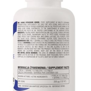 OstroVit IODIDE Potassium Iodide – це харчова добавка в таблетках, що містить йод у формі йодиду калію. Йод є важливим мікроелементом для людини, який ми повинні отримувати з їжею, але через його часту нестачу рекомендується додавати добавки. Добова потреба дорослої людини в цьому елементі становить від 150 до 300 мікрограмів. Йод відіграє особливу роль у належному функціонуванні нашої щитовидної залози та безпосередньо бере участь у виробництві гормонів щитовидної залози, таких як тироксин, відомий як Т4, і трийодтиронін, або Т3. Це важливі гормони, які регулюють правильне функціонування всього нашого організму. Йод у формі йодиду є невід’ємною складовою секреції щитовидної залози, яка регулює клітинний обмін речовин і вироблення енергії. Переваги: