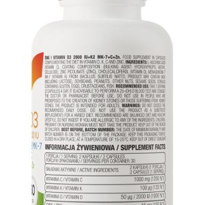 Склад 1 порції (1 капсула) OstroVit Вітамін D3 2000 МО + K2 MK-7 + C + Zn: вітамін D3 (холекальциферол) – 25 мкг; вітамін К2 (менахінон-7) – 50 мкг; вітамін С (L-аскорбінова кислота) – 500 мг; цинк (піколінат цинку) – 7,5 мг. Інші інгредієнти: гідроксипропілметилцелюлоза.