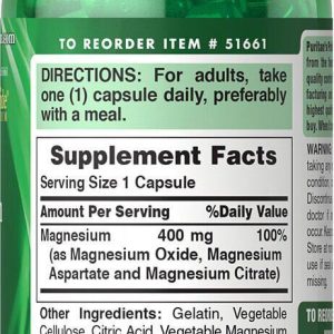 Магній – важливий елемент, який допомагає підтримувати оптимальне функціонування тіла. В цілому від магнію залежить нормальний перебіг понад 300 різних обмінних реакцій в організмі. Іноді виникає підвищена потреба організму в магнії-це відбувається при інтенсивних та регулярних фізичних і психічних навантаженнях, при постійних стресах, при незбалансованому харчуванні і в період активного росту. Ефективним додатковим джерелом магнію стане Puritan’s Pride Triple Magnesium Complex. Склад 1 таблетки: Магній (як оксид магнію,аспартат и цитрат магнию) – 400 мг Спосіб застосування: дорослим приймати по одній (1) таблетці в день, бажано під час їжі.
