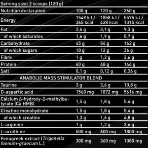 Anabolic Massзабезпечить ваш організм легко засвоюваними вуглеводами у вигляді мальтодекстрину та глюкози, які допомагають відновити функціонування м’язів після напружених та тривалих фізичних навантажень, що призводять до м’язової втоми та виснаження глікогенових запасів. А також високоякісними білками у вигляді білкового комплексу, що включає: концентрат сироваткового білка Carbelac®, ізолят сироваткового протеїну Isolac®, гідролізований ізолят сироваткового протеїну Optipep®, гідролізат казеїну PeptoPro®. Таке ефективне поєднання різних видів протеїну забезпечує пікову концентрацію амінокислот відразу після прийому і в той же час білки, що повільно засвоюються, гарантують тривале харчування м’язів. Білки сприяє зростанню та підтримці м’язової маси, його вживання – необхідний пункт збалансованого харчування будь-якого спортсмена.