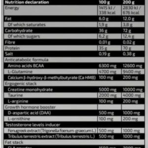Gold Oat Meal містить високоякісну протеїнову матрицю, що складається із швидких та повільних білків для забезпечення безперебійного постачання амінокислот у м’язовій тканині. Складні вуглеводи надходять із вівса, забезпечуючи достатню та тривалу енергію. У кожній порції гейнера міститься 40 г білка з повноцінним амінокислотним профілем і високим вмістом ВСАА (9,7 г) і 40 г складних вуглеводів при мінімальній кількості цукру – 1,8 г на порцію.