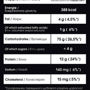 12 грамм белка, 2 г креатина и 75 грамм углеводов на порцию;