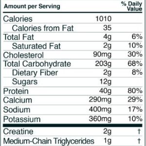 Вуглеводна суміш (мальтодекстрин, натуральні рисові висівки, гороховий крохмаль [Carb10 TM ]), протеїнова суміш (концентрат сироваткового протеїну, ізолят сироваткового протеїну, гідролізат сироваткового протеїну), натуральні та штучні ароматизатори, лецитин, креатин, креатин екстракт листя стевії.