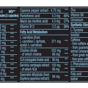 збагачений L-карнітином, L-тирозином, CLA, HCA або інозитом; містить 11 рослинних екстрактів (каєнський перець, чорний перець, корінь Coleus forskohlii, листя зеленого чаю, зелена кава, гуарана);