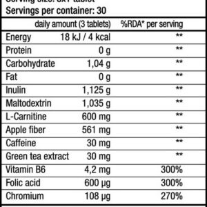 Mega Fat Burner — метаболический препарат, разработанный с целью способствовать нормальному обмену жиров и углеводов благодаря хрому. Зелёный чай и кофеин способствуют концентрации внимания в трудные периоды диеты. Кроме того, дополнительно обогазщен клетчаткой из яблок и L-карнитином.
