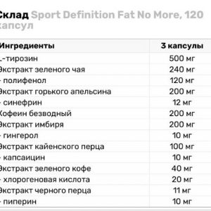 Sport Definition Fat No More – потужний термогенний жироспалювач від європейського бренду спортивного харчування. Комплекс спрямований на прискорення метаболізму, спрощення спалювання жиру та формування привабливого силуету. Також добавка підвищує витривалість та сприяє підвищенню ефективності силових тренувань.