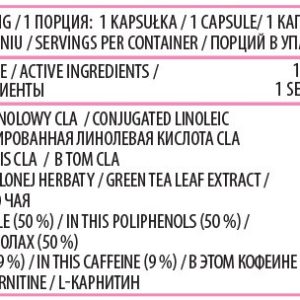 Кон’югована лінолева кислота CLA, тригліцериди середнього ланцюга (MCT), желатин, екстракт зеленого чаю (Camellia sinensis L.), що містить 50% поліфенолів та 9% кофеїну, L-карнітин, зволожувач – гліцерин; емульгарор – лецитин (із сої), сорбіт, бджолиний віск; вода, барвники: діоксид титану, кармін.