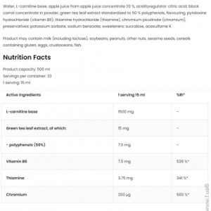 Вода, основа L-карнітину, яблучний сік із концентрату яблучного соку 20 %, регулятор кислотності: лимонна кислота; концентрат чорної моркви у порошку, екстракт листя зеленого чаю, стандартизований до 50 % поліфенолів, ароматизатор, гідрохлорид піридоксину (вітамін В6), гідрохлорид тіаміну (тіамін), піколінат хрому (хром), консерванти: сорбат калію, бензоат натрію; підсолоджувачі: сукралоза, ацесульфам До.
