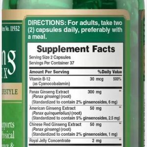 Ginseng Complex Puritan’s Pride – це потужна формула, створена для підвищення енергії, підтримки імунної системи та поліпшення загального тонусу організму. Вітамін B-12 допомагає підтримувати здоров’я нервової системи та сприяє нормалізації обміну речовин. Екстракти женьшеню відомі своїми адаптогенними властивостями, здатними поліпшити стійкість організму до стресів і фізичних навантажень. Американський і Китайський женьшень підтримують когнітивні функції, допомагають впоратися з втомою і підвищують витривалість.