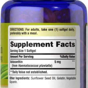 Puritan’s Pride Astaxanthin 5 mg Softgels особливо рекомендується до вживання людям, чий організм потребує додаткової підтримки. Склад однієї порції (1 капсула) % кількість на порцію від денної норми Астаксантин (з Haematococcus pluvialis) 5 мг Інші інгредієнти: соняшникова олія, желатин, рослинний гліцерин. Спосіб застосування та дози: дорослим приймати по одній (1) м’якій капсулі двічі на день, бажано під час їжі.
