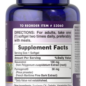 Біологічно активна добавка Puritan’s Pride Resveratrol заснована на потужному антиоксиданті, що перевищує ефективність бета-каротин, вітамін Е і вітамін С. Продукт розроблений кращим брендом харчових добавок для підтримки активного і здорового довголіття. Одна капсула містить більше ресвератролу, ніж пляшка червоного вина.