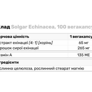 Solgar Echinacea – рослинні капсули з високоякісною добавкою ехінацеї. Капсульована форма гарантує точне дозування активних речовин та робить прийом добавки більш зручним. Особливості та переваги Solgar Echinacea: базується на натуральному екстракті ехінацеї; поєднує у собі переваги як сирої рослини, так і її активних компонентів у формі сухих екстрактів; включає всі природні синергетичні компоненти рослини, а не лише відібрані ізольовані активні фітохімічні речовини; збагачений вітаміном А; допомагає організму протистояти бактеріальним, вірусним, грибковим інфекціям; позитивно впливає на роботу імунної системи; не містить глютену, пшениці, цукру. Solgar Echinacea особливо рекомендується до вживання людям, які прагнуть підтримати свій організм.