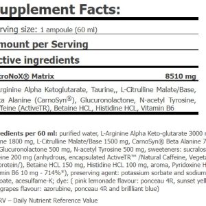 сильний пампінг буде забезпечений солідною дозою аргініну ААКГ (3000мг) та цитруліну малату (1500мг),