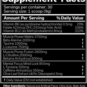 Матриця для м’язової потужності заснована на бета-аланіні, таурині та L-лейцині. Ці компоненти підвищують рівень оксиду азоту, стимулюють зростання енергії та захищають від втоми.