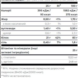 Змішайте одну порцію (1 мірна ложка – 25 г) продукту в 300 мл води або молока. Найкращий час для прийому – після тренування.