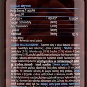 Hyaluronic Acid – біологічно активна добавка на основі 100% гіалуронової кислоти. Гелеподібна водозвязуюча молекула надає широкий вплив на організм. Це речовина, що становить основу сполучної тканини. Завдяки цьому вона має позитивний вплив на функціонування кісток і суглобів. Зазвичай його роль полягає у забезпеченні адекватної амортизації суглобових поверхонь, оскільки вона заповнює вільні міжклітинні простору. Може пом’якшувати суглоби і сприяє посттравматичного одужання. Вона також забезпечує правильне зволоження шкіри і волосся. Це також сприяє поліпшення еластичності шкіри і бере участь в регенерації тканини. Особливо важливо в літній період, коли при впливі ультрафіолету на шкіру відбувається запалення, при цьому в клітинах дерми припиняється синтез гіалуронової кислоти. Переваги: