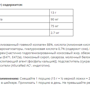 Collagen от компании BioTech USA – это гидролизированный коллаген высокого качества. Данная добавка обеспечивает гиалуроновой кислотой и коллагеном одновременно. В ней так же содержится витамин С, который способствует выработке коллагена организмом, что помогает сохранить здоровье вашей кожи, хрящей, связок, кровеносных сосудов, костей и зубов. Добавление в этот продукт витамина Е играет важную роль в защите клеток против окислительного стресса.