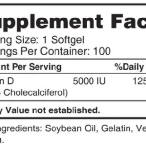 В одній м’якій желатинової капсулі Earth Creation міститься 5000IU Вітаміну Д3. Вітамін D3 допомагає підтримувати здоров’я кісток у дорослих і необхідний засвоєння кальцію.