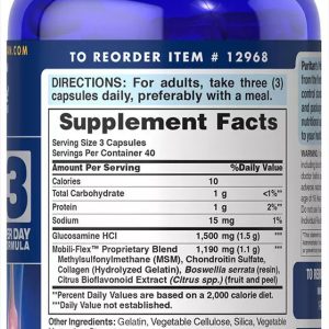 Mobili-Flex™ Proprietary Blend Methylsulfonylmethane (MSM),Chondroitin Sulfate,Collagen (Hydrolyzed Gelatin), Citrus Bioflavonoid Complex(Citrus spp.) (fruit and peel), Boswellia serrata (resin) – 1,194 mg (1.1 g)